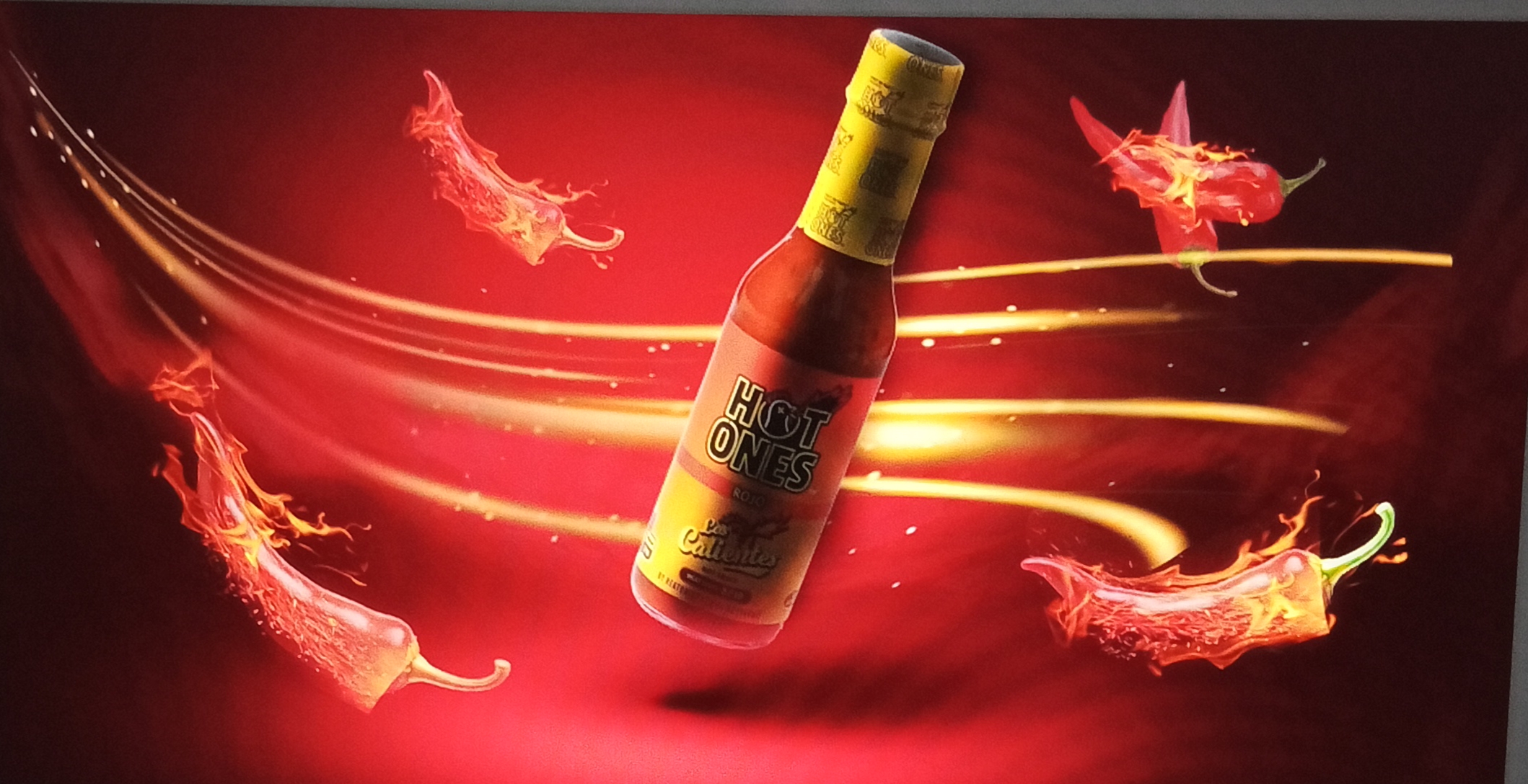 - استخدمت حبات الفلفل الحار المنتشرة حول الزجاجة، مصممة لتبدو وكأنها مشتعلة، لتجسيد قوة الحرارة والطعم اللاذع للصلصة بشكل بصري لا لبس فيه.