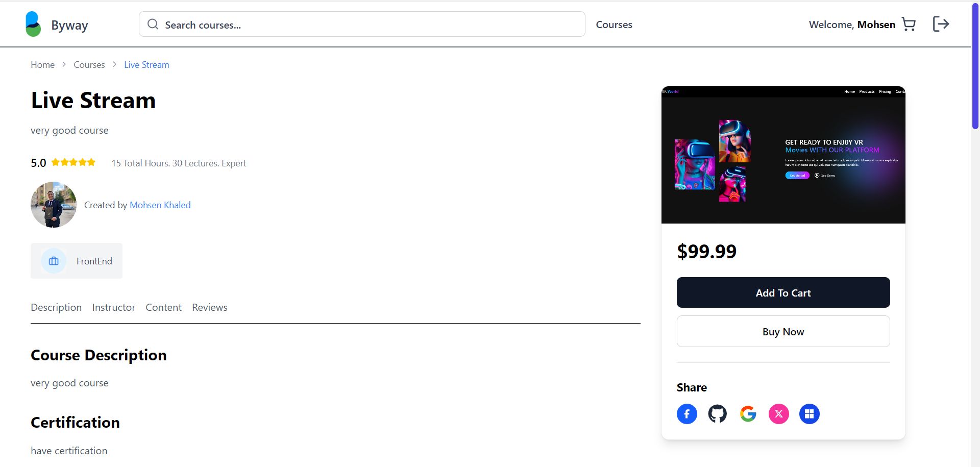 لقد قمت بتطوير منصة تعليمية إلكترونية متكاملة كحل Full-Stack، تهدف إلى توفير بيئة تفاعلية للمستخدمين لتصفح، شراء، وإنشاء الدورات التعليمية عبر الإنترنت بفعالية واحترافية. توليت مسؤولية تطوير الواجهة الأمامية والخلفية بالكامل، لتقديم تجربة مستخدم شاملة ومرضية.