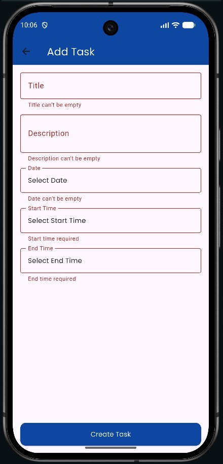 يتيح التطبيق للمستخدمين إنشاء المهام وإدارتها وتتبعها بناءً على تواريخ محددة، مع واجهة نظيفة ومنظمة تم تنفيذها بدقة عالية وفق تصميم Figma لضمان تناسق بصري وجودة عالية في تجربة المستخدم.