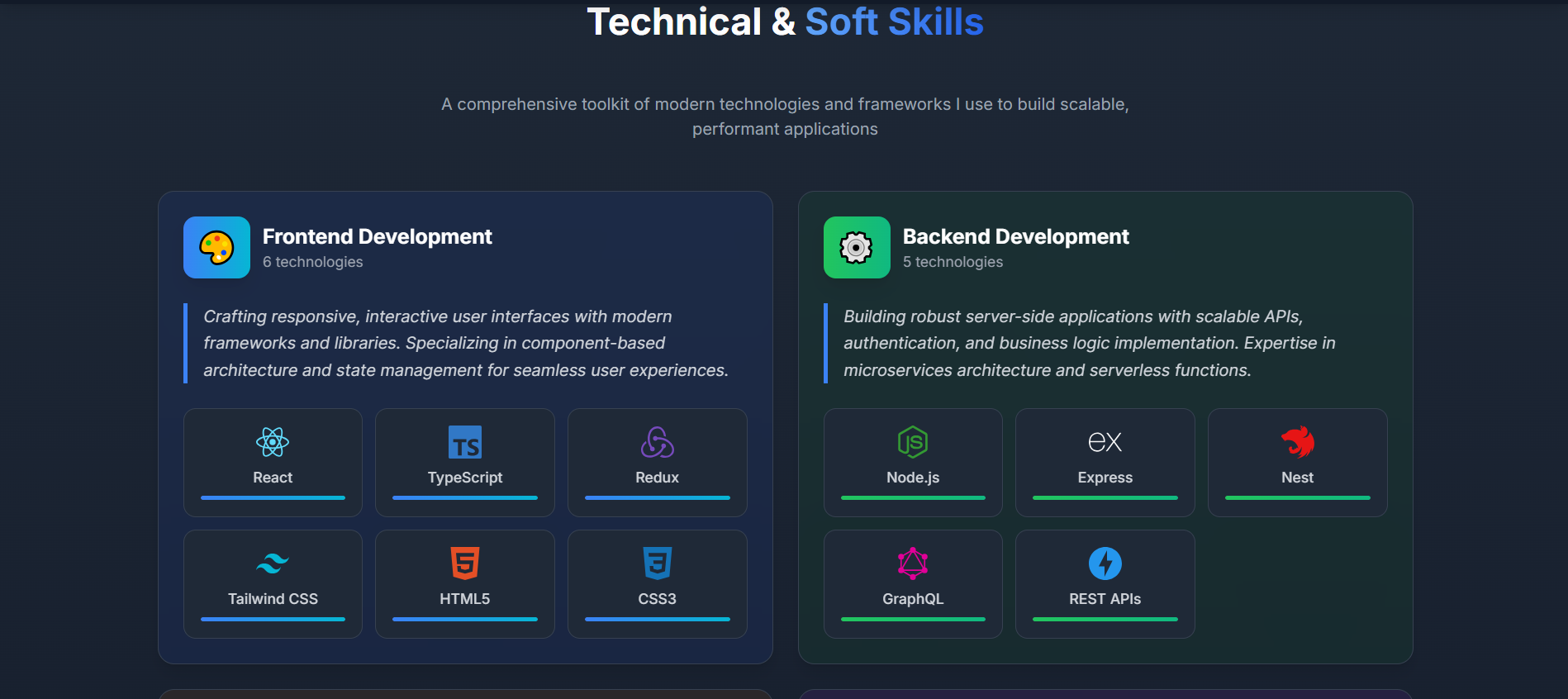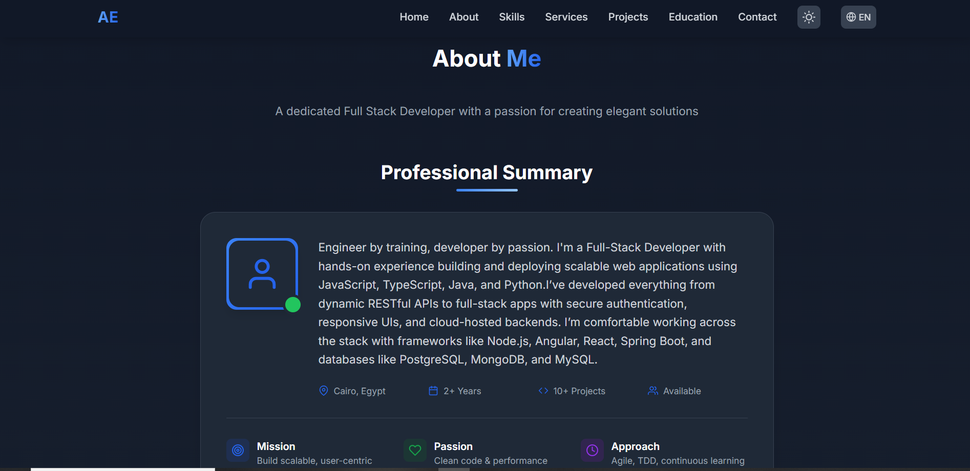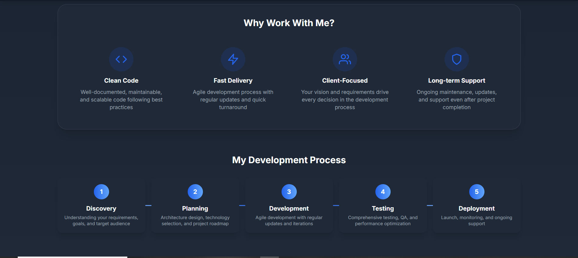 الموقع يعكس هويتي كمطور Full Stack، ويعرض المشاريع بشكل منظم وجذاب يساعد العملاء على استكشاف أعمالي بسهولة.