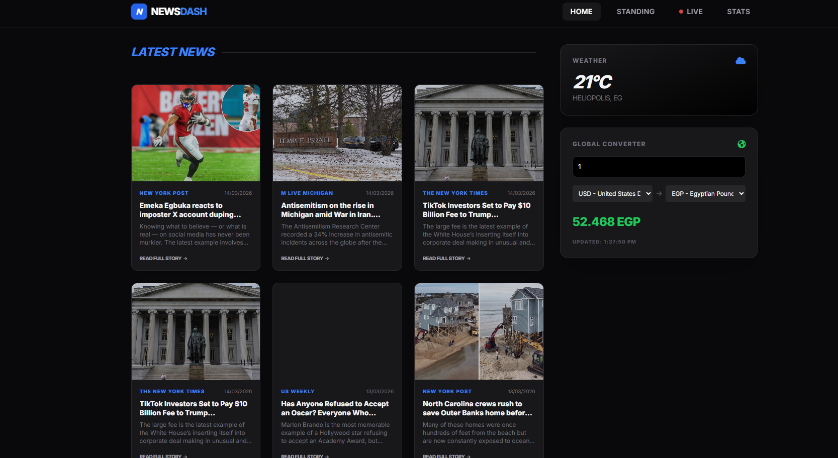 تصميم متجاوب (Responsive Design): تم بناء الموقع باستخدام تقنيات Tailwind CSS ليظهر بشكل مثالي على جميع الأجهزة (موبايل، تابلت، كمبيوتر) مع قائمة جانبية