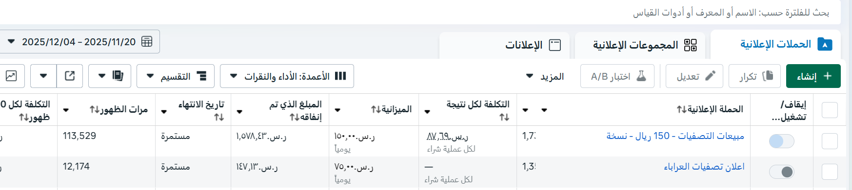 تحليل سريع:الحملة قدرت توصل للإعلان لأكثر من 35 ألف شخص وحققت 402 زيارة للموقع بتكلفة نقرة منخفضة نسبيًا (1.18 ريال)، وده يدل إن الاستهداف والكلمات المستخدمة كانت مناسبة وجذابة للجمهور.