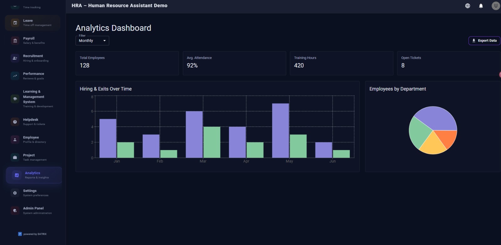 نظام HRA باستخدام React وTypeScript، يعتمد على واجهات تفاعلية وسريعة لتسهيل إدارة الموارد البشرية، مثل متابعة الموظفين، إدارة الإجازات، تقييم الأداء، والتقارير الإدارية. الهدف من النظام هو تبسيط العمليات الإدارية وتحسين كفاءة العمل داخل الشركة، مع تجربة مستخدم سلسة وواجهة متجاوبة لجميع الأجهزة.