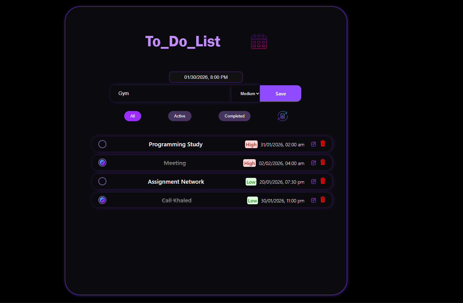 تخزين البيانات (Local Storage): الموقع مربوط بذاكرة المتصفح، يعني لو قفلت الجهاز وفتحته تاني، هتلاقي كل مهامك موجودة زي ما هي.