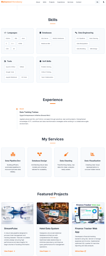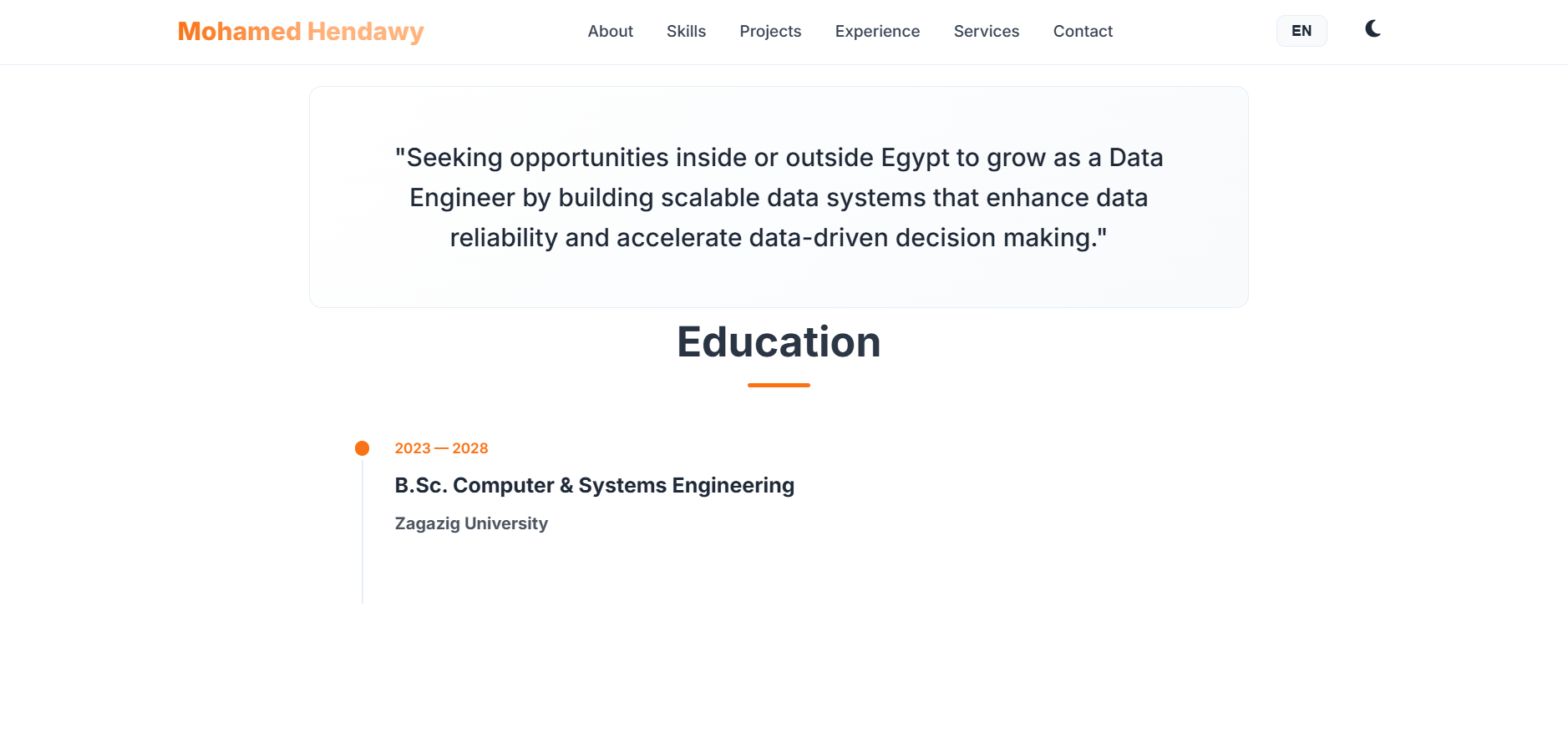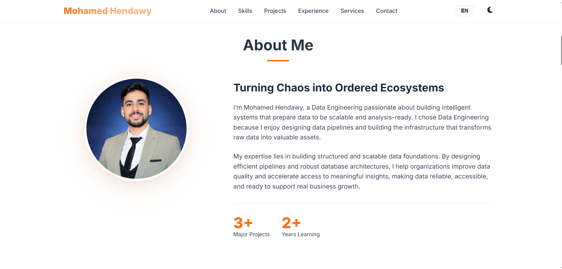 تصميم وتطوير موقع بورتفوليو شخصي لعرض الأعمال والخدمات بشكل احترافي باستخدام تقنيات ويب حديثة مع تصميم متجاوب وسريع يوفر تجربة مستخدم سهلة وجذابة ويساعد على إبراز المهارات والمشاريع بشكل واضح ومنظم.