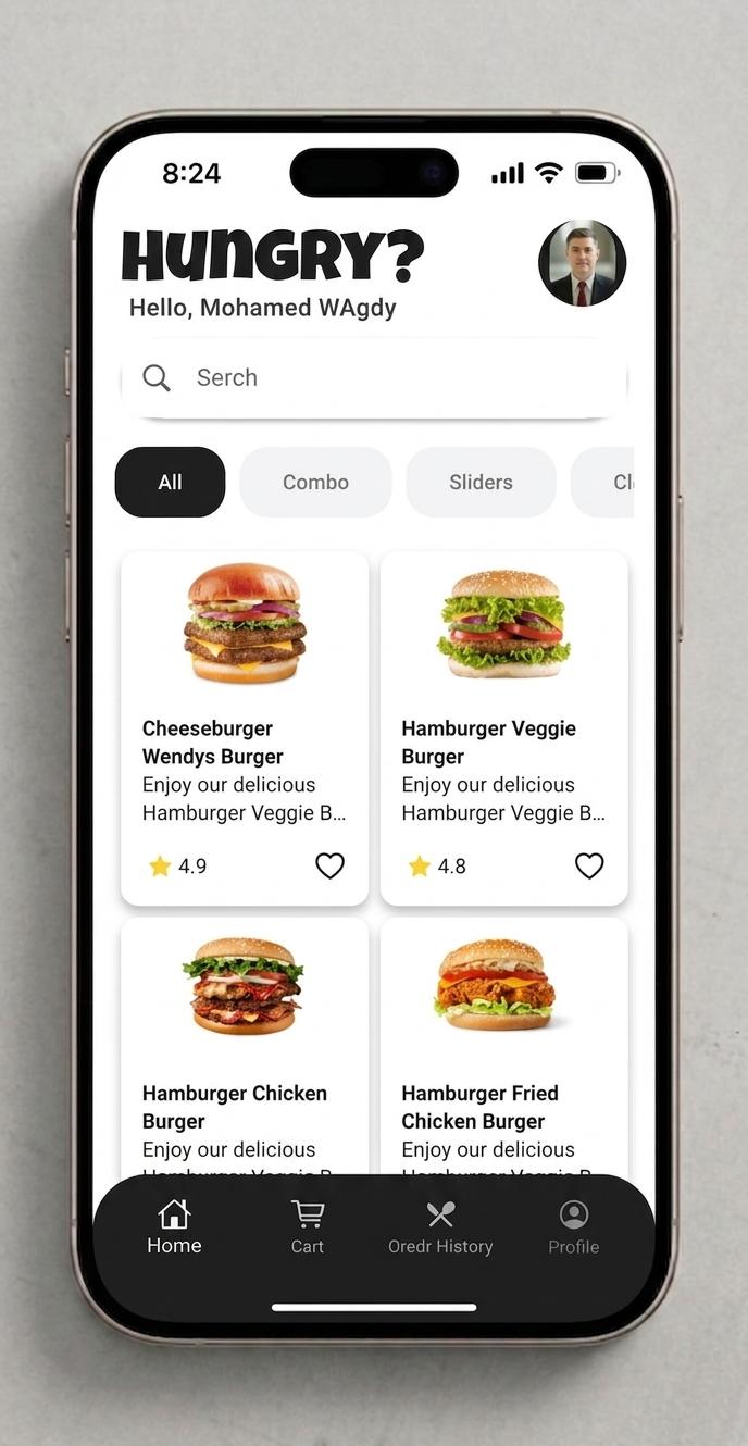 تطبيق "Hungry" هو تطبيق متكامل لطلب وتوصيل الطعام، تم بناؤه باستخدام إطار العمل Flutter. يتميز التطبيق بكونه نظاماً برمجياً حقيقياً وليس مجرد واجهات رسومية، حيث تم ربطه بالكامل بـ RESTful APIs لإدارة البيانات والعمليات في الوقت الفعلي.
