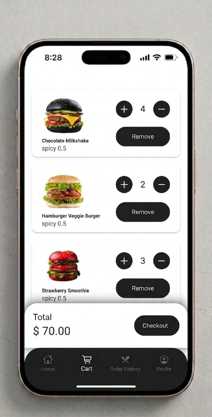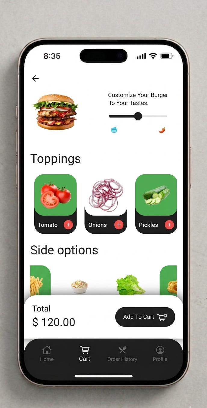 تجربة مستخدم (UX) متطورة: مسار طلب كامل يبدأ من تصفح الوجبات، إضافة الإضافات (Toppings)، وصولاً إلى سلة المشتريات وحساب الإجمالي برمجياً.