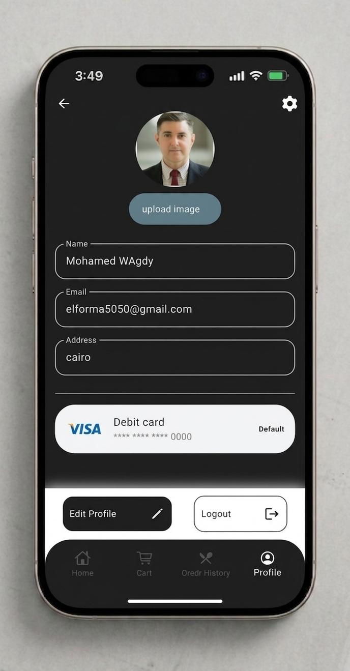 الملف الشخصي وإدارة الطلبات: شاشة ملف شخصي لعرض بيانات المستخدم وطرق الدفع المحفوظة.