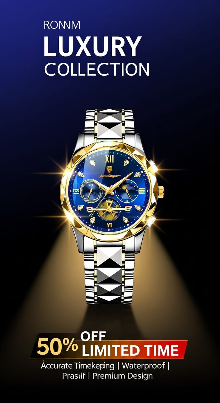 - ركزت على إظهار المنتج بتقنية ثلاثية الأبعاد متقنة، مع توظيف إضاءة درامية احترافية لتسليط الضوء على أدق التفاصيل والميزات الجمالية للساعات، مما يضيف عمقًا وواقعية للتصميم.