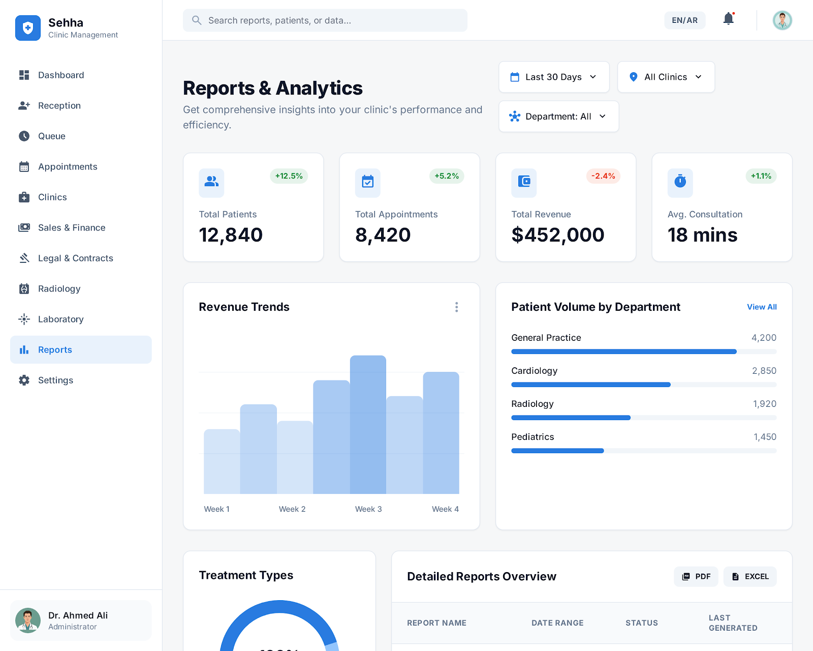 إدارة الحجوزات وقوائم الانتظار: تنظيم مواعيد الزيارات، وتتبع حالة المريض في العيادة لحظة بلحظة (في الانتظار، قيد الكشف، مكتمل).
