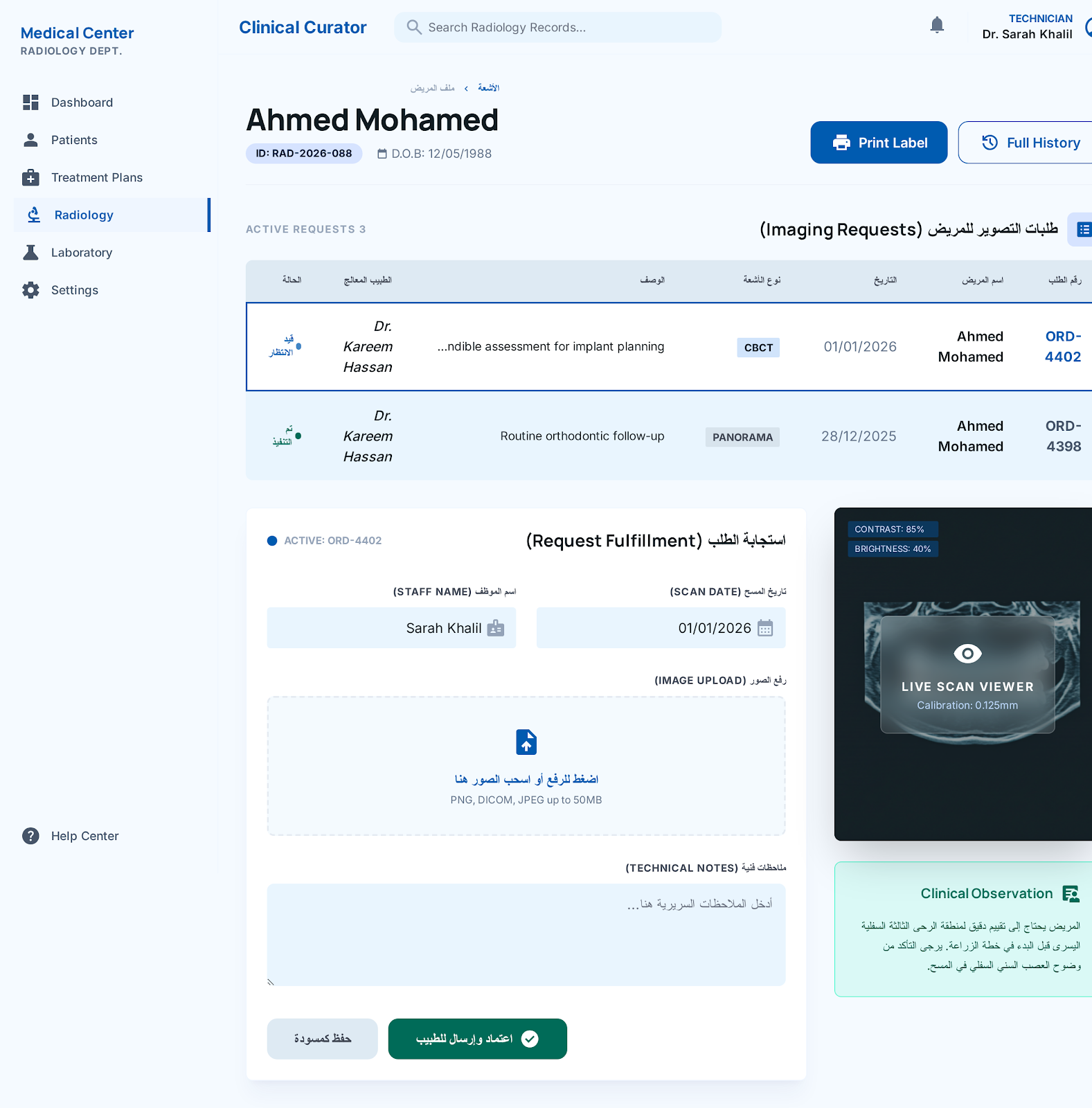 إدارة ملفات المرضى: تسجيل بيانات المرضى كاملة (بيانات أساسية، تاريخ طبي، توثيق الهوية بالصور، وملفات الـ PDF).
