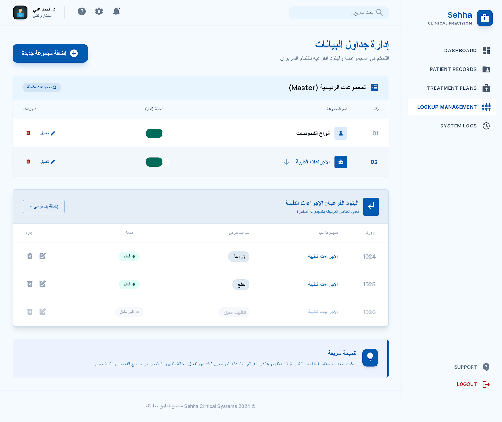 الدورة الطبية والتشخيص: تسجيل الشكاوى الطبية، التشخيص، طلبات الأشعة والتحاليل، وإصدار الوصفات الطبية (الروشتات).
