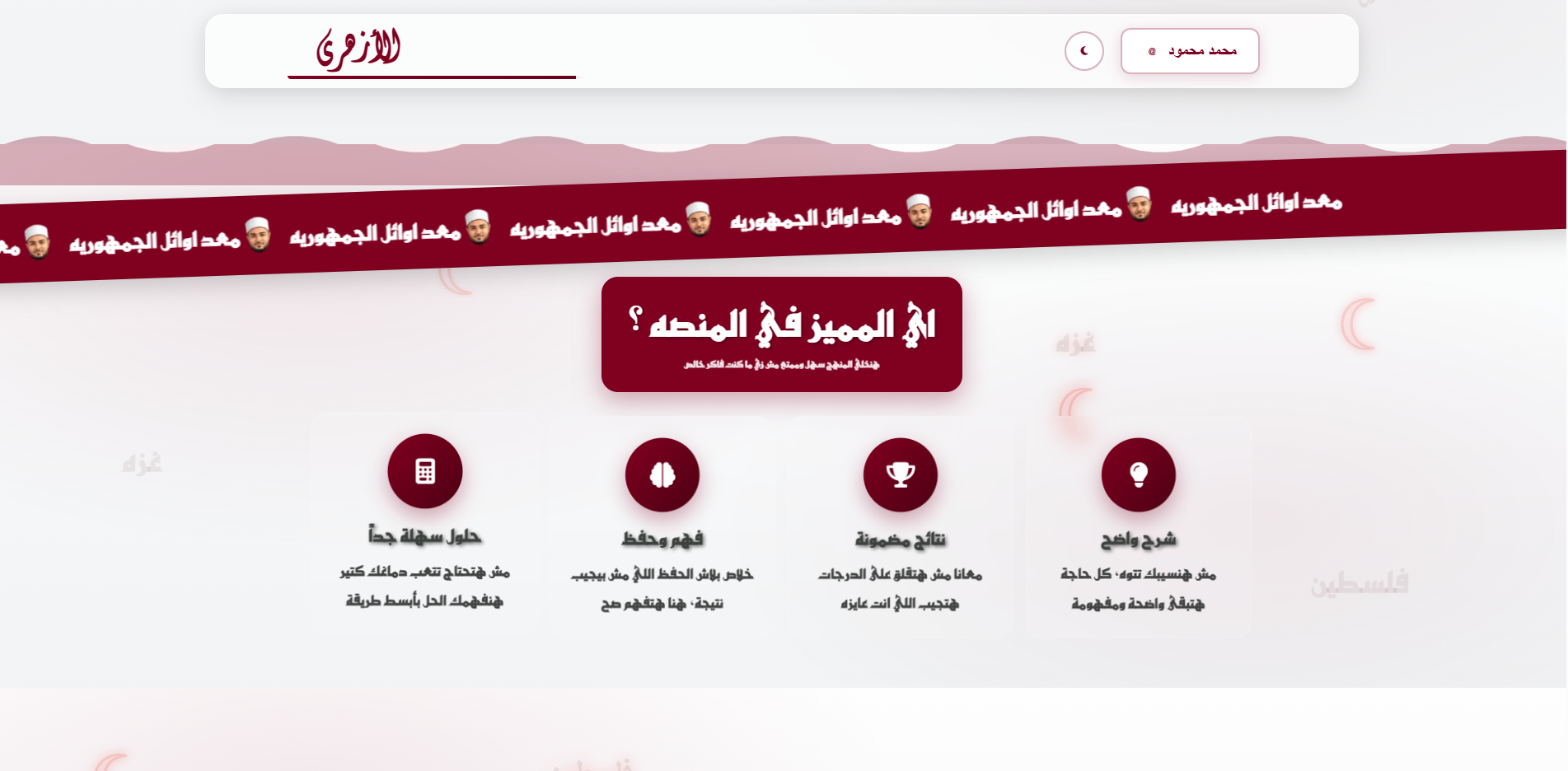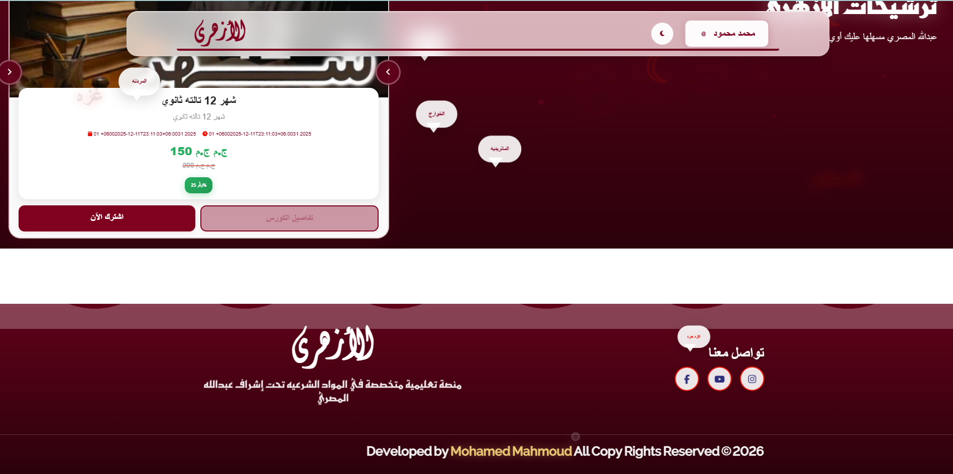 أنا طوّرت منصة تعليمية متكاملة باسم الأزهري، موجهة لطلبة الثانوية الأزهرية. المنصة بتضم نظام كورسات إلكترونية مصنّفة حسب الصفوف الدراسية (ثاني ثانوي، ثالث ثانوي…) مع قوائم واضحة للطلاب والمعلمين، وواجهة مستخدم سهلة الاستخدام.