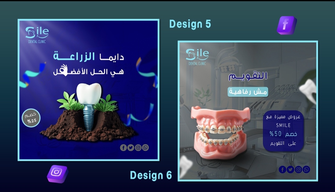 SMILE تهدف إلى بناء هوية بصرية كاملة لعيادة سمايل لطب الأسنان، من تصميم الشعار وتطوير هوية العلامة التجارية المتماسكة إلى تنفيذ تصاميم وسائل التواصل الاجتماعي تقوم الهوية على نمط بسيط ونظيف يعكس الاحترافية والراحة والثقة، وذلك باستخدام ألوان هادئة من الدرجة الطبية وعناصر بصرية تدعم مفهوم الابتسامة الجميلة ورعاية الأسنان الممتازة