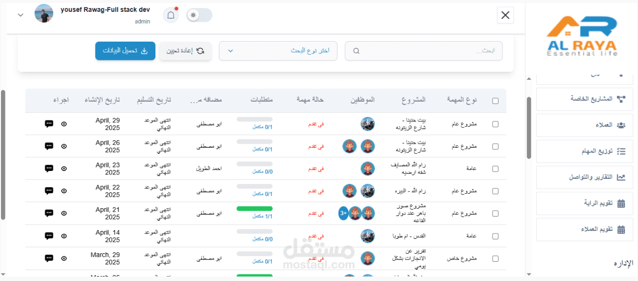 نظام CRM العقاري هو منصة متكاملة صممت خصيصًا لشركات التسويق العقاري لتسهيل إدارة العملاء وتنظيم المشاريع ومتابعة فرق العمل بشكل أكثر كفاءة واحترافية. يوفر النظام إمكانية إدارة المشاريع من خلال إضافة جميع بياناتها والمرفقات الخاصة بها وربطها بالمهام والفريق المسؤول، كما يسمح بإنشاء وإدارة المهام وتوزيعها على أكثر من موظف مع ربط كل مهمة بمشروع محدد ومتابعة التقدم في إنجازها مع وجود شات داخلي داخل كل مهمة لتوثيق العمل وتنسيق الفريق. كما يحتوي النظام على تقارير ذكية يومية وأسبوعي