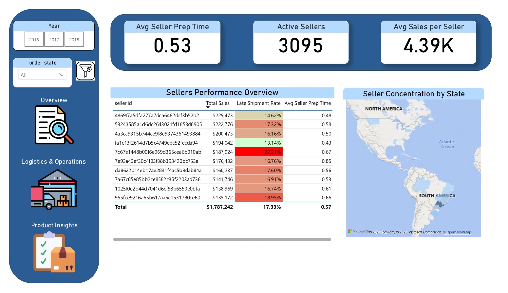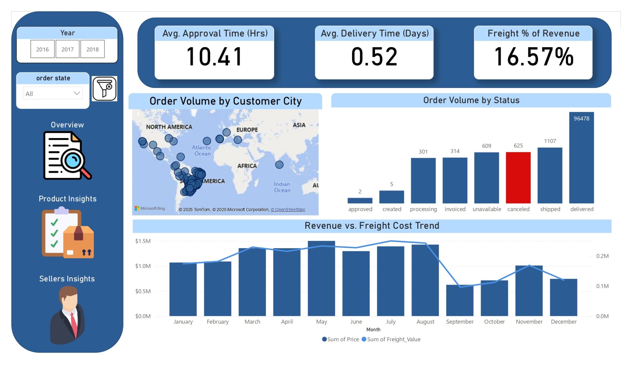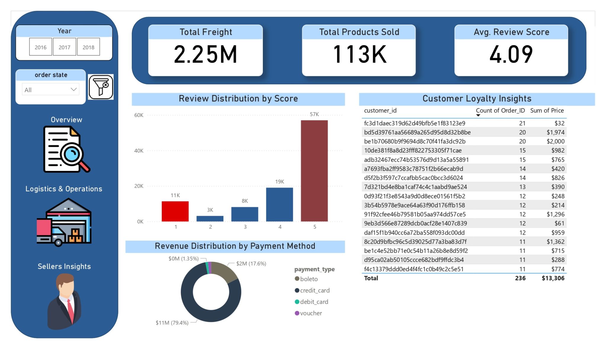 تطوير لوحة تحكم تفاعلية (Power BI Dashboard): بناء لوحة تحكم مكونة من 4 صفحات لمتابعة إيرادات بقيمة 14 مليون دولار، وتتبع مؤشرات الأداء الرئيسية (KPIs) للعمليات اللوجستية ورضا العملاء.