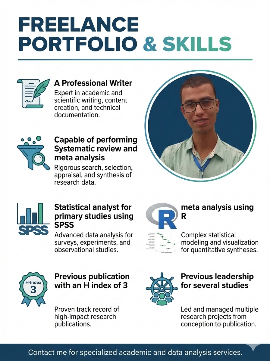 I'm Abdelmonam Hagag, A professional medical content writer Specialized in medical research writing and statistical analysis Can perform different study designs including meta analysis using R program
